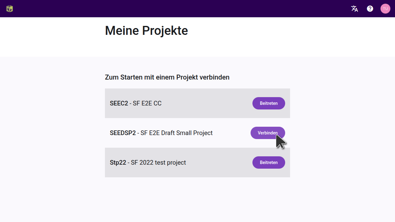 Um ein Paratext-Projekt in Scripture Forge zu verbinden, melde Dich mit Paratext an. Wenn Du Dich anmeldest, wird die Seite Meine Projekte geladen. Wenn Du Dich auf einer anderen Seite in Scripture Forge befindest, kannst Du die Seite Meine Projekte aufrufen, indem Du auf das Scripture Forge-Logo in der oberen linken Ecke der Seite klickst. Die Seite Meine Projekte listet alle Projekte auf, an denen Du in Paratext beteiligt bist, einschließlich derer, die mit Scripture Forge verbunden sind, und derer, die noch nicht verbunden sind. Wenn bereits ein Projekt verbunden wurde und Du Mitglied des Paratext-Projekts bist, kannst Du dem Scripture Forge-Projekt beitreten, indem Du auf Beitreten klickst. Falls das Projekt noch nicht verbunden wurde und Du einer der Administratoren des Projekts bist, klicke auf Verbinden. Nur Administratoren können ein Projekt auf dieser Seite verbinden.