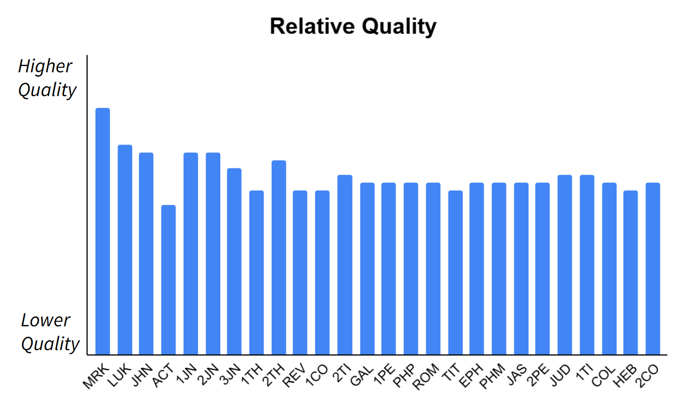 With the introduction of New Testament draft generation, Scripture Forge has developed a method of estimating the quality of the generated draft. Book-level draft quality can be used as a guide for strategic decisions regarding book sequencing. Chapter-level draft quality can be used to evaluate the need for incremental draft generation, or to anticipate the time needed for editing, improvement, and checking. It is important to understand these values as draft quality estimates, and use them for general insights and guidance, rather than as quality checking tools.