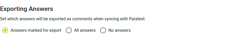 If you would prefer to have all answers exported to Paratext without individually marking them for export, go to the project settings and find the Exporting Answers section. The default option is to only export Answers marked for export, but this setting can be changed to All answers or No answers.